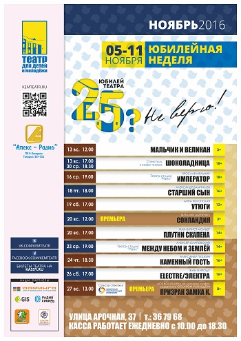 Любимый всеми театр отмечает свое 25-летие. В рамках этого события с 5 ноября по 11 ноября пройдет акция «Юбилей театра: 25? Не верю!». Театр представит любимые спектакли, арт-проекты, театральные акции и многое другое.