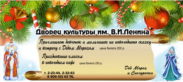 Сотрудники ДК приготовили для детей настоящую новогоднюю сказку и встречу с главным волшебником зимы. Есть возможность отпраздновать новый год целым классом в кафе.