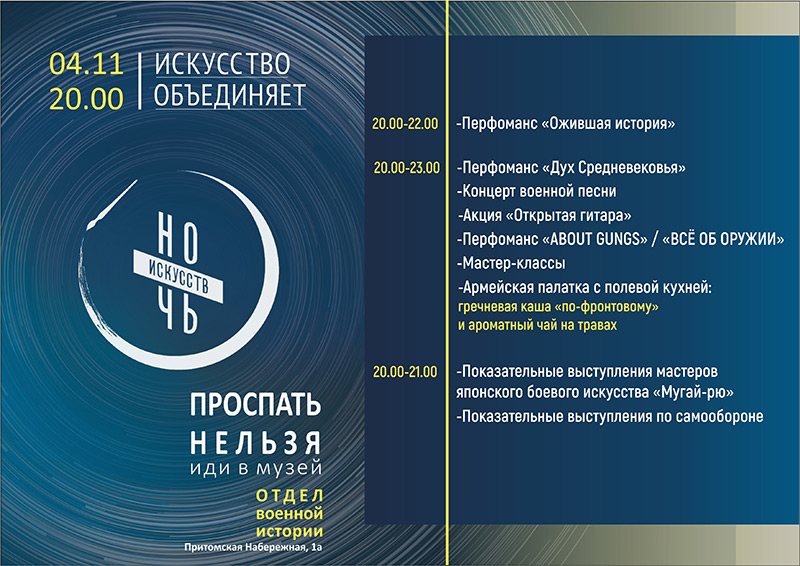 Побывать сразу в нескольких исторических эпохах Вы сможете в день ежегодной Всероссийской акции "Ночь искусств"! Вы погрузитесь в историю батальных сражений разных столетий, в каждом из которых Вас будут сопровождать воины разных лет.