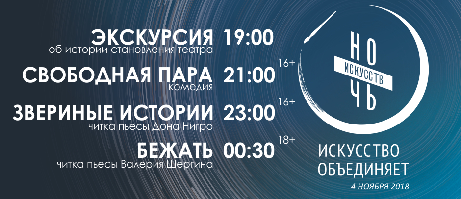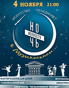 Маленьких зрителей будут встречать сказочные персонажи из любимых детских спектаклей. Они разучат с ребятишками веселую песенку, нарисуют красивый сказочный грим, дадут примерить парики и элементы костюмов, создадут сказочный реквизит. Всех, кто любит танцевать, ждет традиционный мастер-класс по танцу. Они смогут отрепетировать хитовый номер из мюзикла "Дубровский". Очень театральная фотозона ждет всех поклонников селфи и необычных фото. Экскурсии в закулисье всегда таинственны и познавательны. И в завершение вечера мы предлагаем посмотреть очень трогательный спектакль "Безымянная звезда" в фойе театра.
