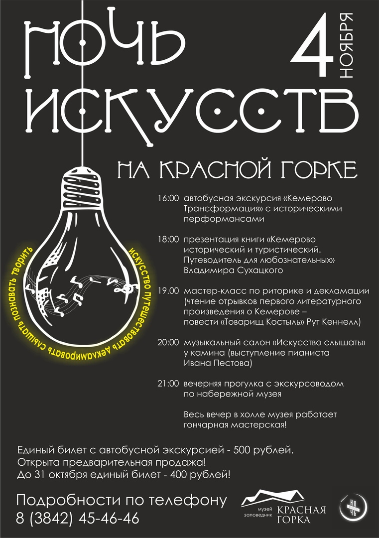 Ежегодная акция "Ночь искусств" пройдет во многих учреждениях г. Кемерово. Событие такого формата придется по душе всей семье. В этом году организаторами "Ночи искусств" выступили театры, музеи и библиотеки. Мастер-классы, концерты, перевоплощения... Можно выбрать семейное мероприятие или оставить деток с бабушкой и насладиться обществом любимого человека.