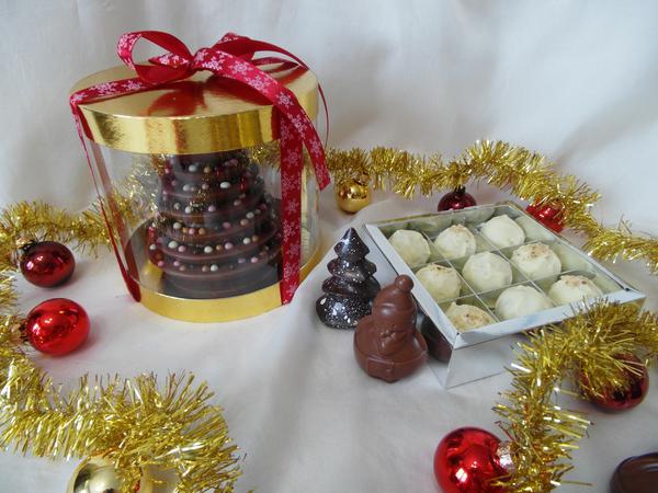 Коробочка сладостей- дед мороз из молочного бельгийского шоколада, елочка из темного бельгийского шоколада, человечек из белого шоколада, печенье бискотти с орешками и вишней, миндаль в шоколаде и бельгийской вафле