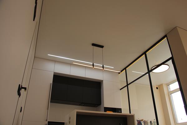 👉 Сложность проекта и соответственно время монтажа зависят от количества и типа осветительных приборов, от вида карнизов и дизайна потолка в целом.