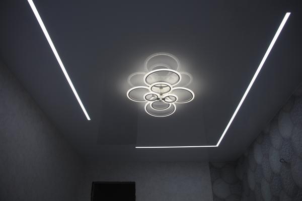Смонтировали натяжной потолок глянцевой фактуры со световыми линиями и люстрой. Как всегда высокое качество материалов и профессиональный, оперативный монтаж. 😍