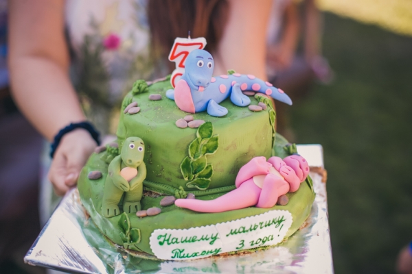 pomidork, наш с динозаврами:) сын был на столько в востроге, что втихаря достал его из холодильника и понес показывать друзьям на второй этаж (дело было на даче) и конечно же уронил. нам крупно повезло, что торт в полете не перевернулся:) в итоге никто и не заметил из гостей, просто изначально местность была ровная под динозаврами, а стала холмистая:-D